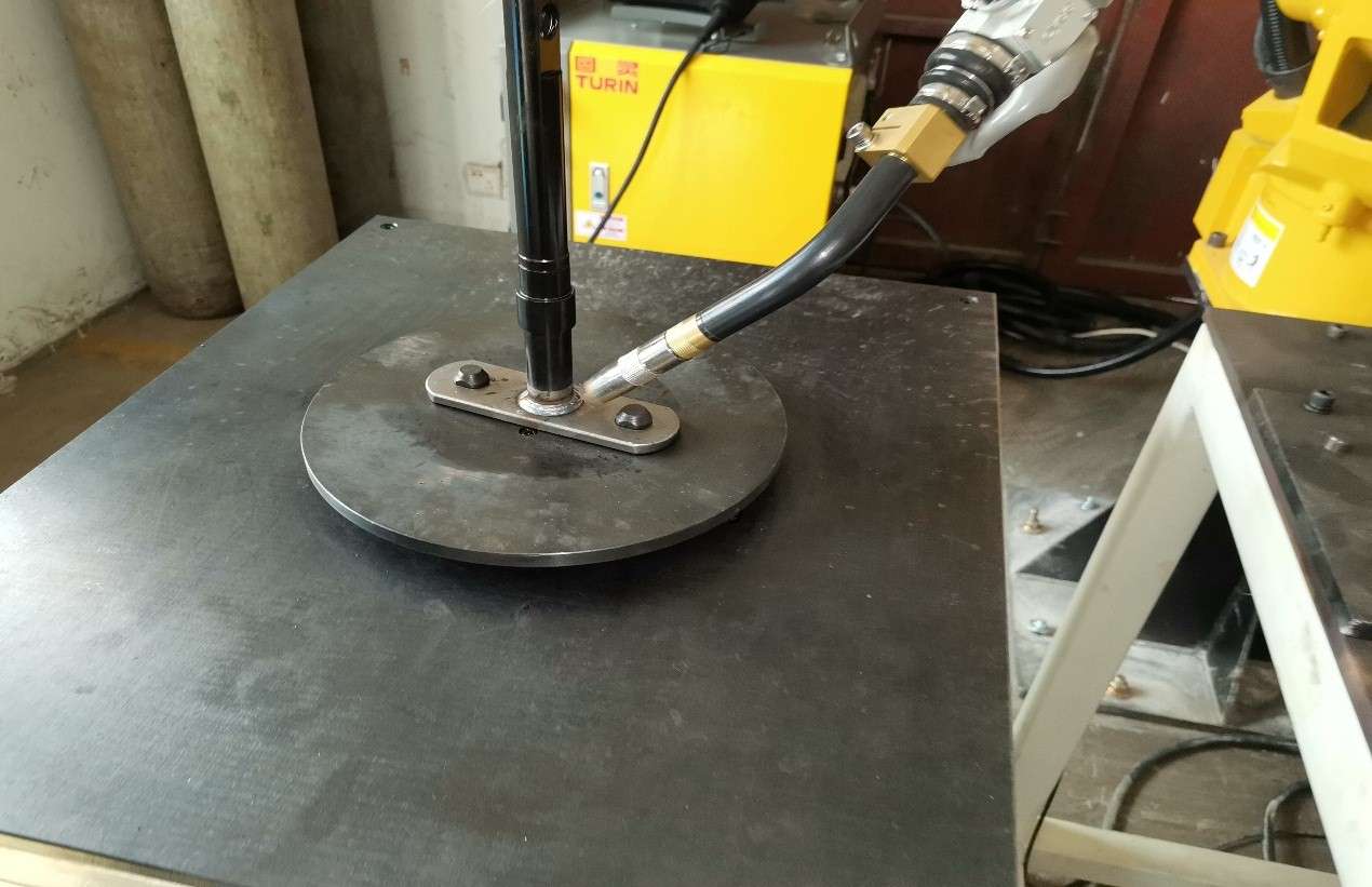 上图为特种链上部焊接,焊接机器人上安装的焊枪到过焊接位置后,启动焊接引弧,同时工装平台通过旋转,实现对圆型轨迹的焊接。焊接后的效果平滑统一,相比机器人带动焊枪进行圆型焊接更具优势。